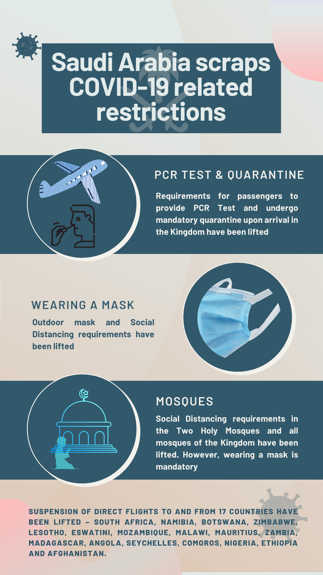 Saudi Arabia also lifted the suspension of direct flights and arrival to the Kingdom from the following countries (Zimbabwe, Lesotho, Eswatini, Mozambique, Malawi, Madagascar, South Africa, Namibia, Botswana, Angola, Seychelles, United Republic of Comoros, Nigeria, Ethiopia, Afghanistan, Mauritius, Zambia)