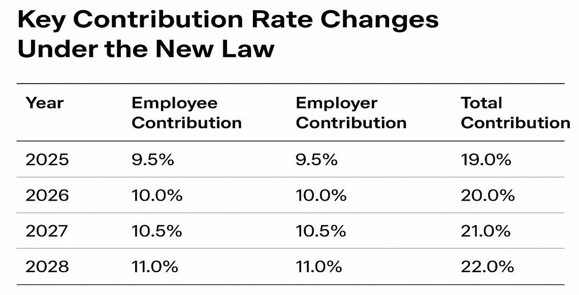 The law introduces a phased increase in contribution rates for both employees and employers over the next few years.